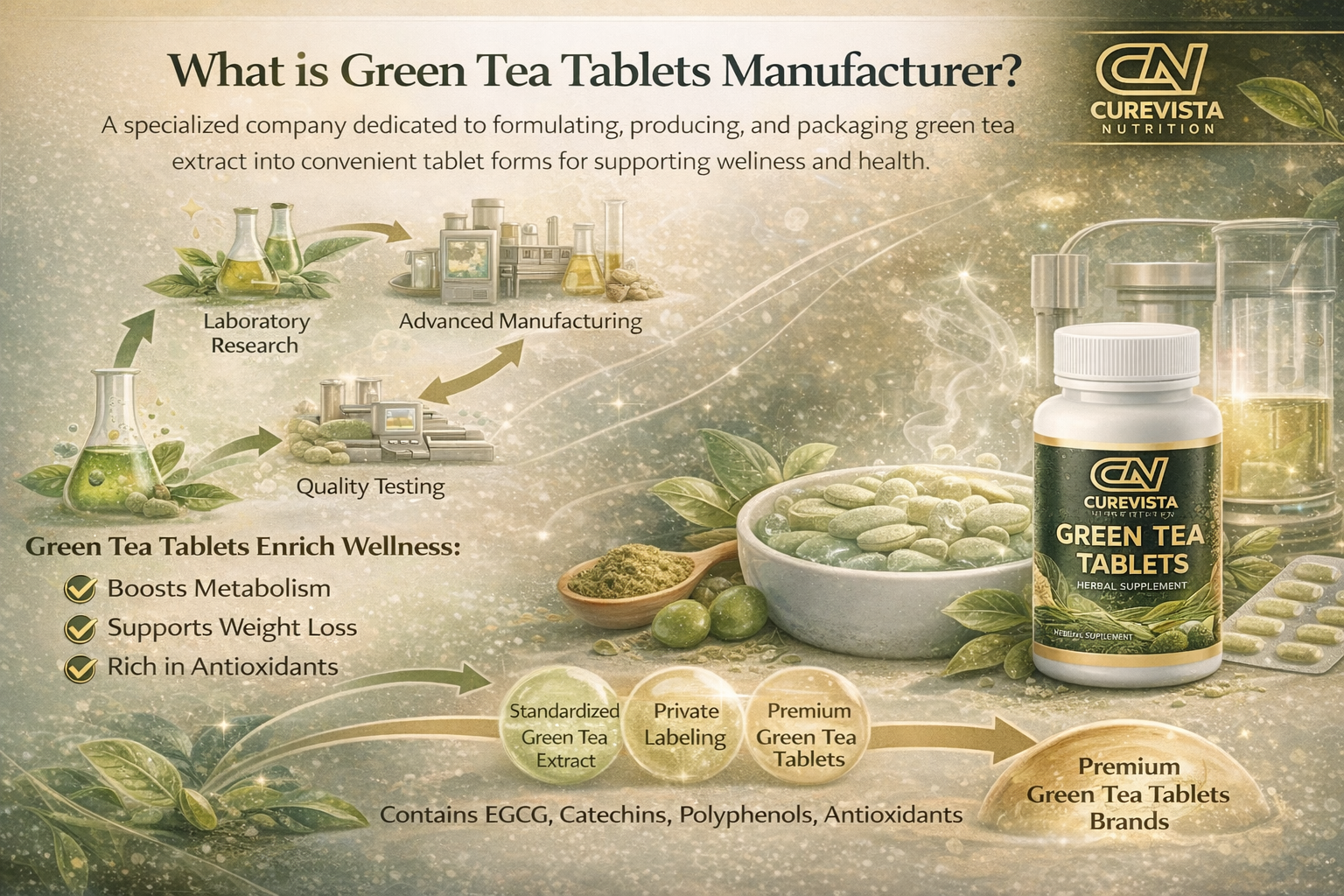 Green tea tablets provide users with a standardised concentration of green tea extract, which delivers better results through easier consumption than brewed tea. Green tea provides multiple benefits, which include weight management, detox support and better heart health and immunity protection. Curevista Nutrition, as the best Green Tea Tablets Manufacturer In India, offers essential manufacturer expertise, enabling companies to maintain their product quality and safety standards, as well as compliance with regulations.